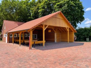 Darüber hinaus wurde ein neuer großer Freisitz / Überdachung am Nebengebäude geschaffen, um auch im Außenbereich witterungsunabhängig Vereinsaktivitäten zu ermöglichen. Mit der Errichtung dieser Überdachung wurde auch die befestigte und graue Fläche gestalterisch aufgewertet. Neue Tische und Bänke laden nun zum Verweilen ein.