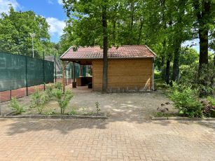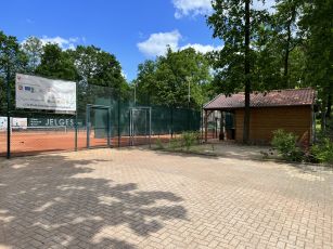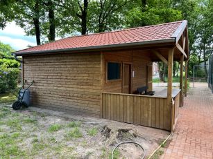 Die vorhandene Lagerhütte kam aus den 80er Jahren, war baufällig und entsprach nicht mehr den Anforderungen und musste ersetzt werden. Die Planung sah den Neubau einer zweigeteilten Holzhütte vor. In einem Raum lagert der Jugendtrainer Bälle und Trainingsmaterial sowie Tennisschläger. In dem anderen Teil lagert der Verein die Platzausstattung wie Netze, Linien, Abziehmatten, Kleinfeldnetze und Low-T-Ball-Anlagen.