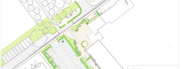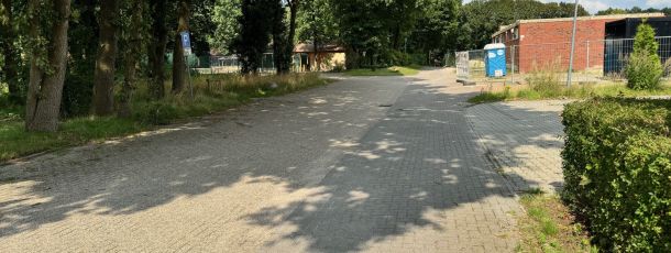 Der vorhandene Parkplatz des Freibades wurde vor ca. 5 Jahren im Rahmen einer ehrenamtlichen Aktion ausgepflastert. Diese Grundlage bleibt bestehen, wird durch Begrünung und dezentrale Regenwasserversickerungsmulden naturnaher gestaltet. Ergänzend wird ein Behindertenparkplatz ausgewiesen und großzügige Fahrradabstellflächen angeboten mit unterschiedlichen Möglichkeiten der Befestigung bzw. Lademöglichkeiten für E-Bikes. Auch eine E-Scooter Abstellfläche wird ausgewiesen.