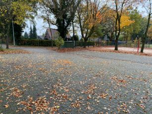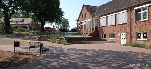 Durch die Verlegung eines geschwungenen Fußweges von oben kommend von der Börgerstraße zum unteren Bereich des Geländes wurde die gesamte Anlage optisch und gestalterisch aufgewertet. Die neuen Wege wurden mit gerumpelten dorftypischen Pflastersteinen hergestellt.