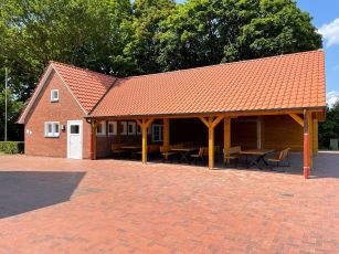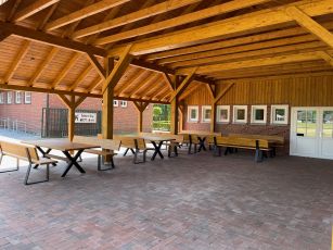 Darüber hinaus wurde ein neuer großer Freisitz / Überdachung am Nebengebäude geschaffen, um auch im Außenbereich witterungsunabhängig Vereinsaktivitäten zu ermöglichen. Mit der Errichtung dieser Überdachung wurde auch die befestigte und graue Fläche gestalterisch aufgewertet. Neue Tische und Bänke laden nun zum Verweilen ein.