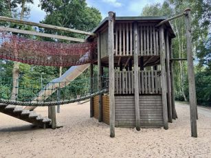 Die Gemeinde Esterwegen hat diesen Spielbereich als erweitertes Mehrgenerationen-Angebot mit zusätzlichen Funktionen versehen und diese durch einen breiten Korridor in Richtung Badesee und Gastronomie geöffnet.