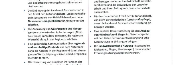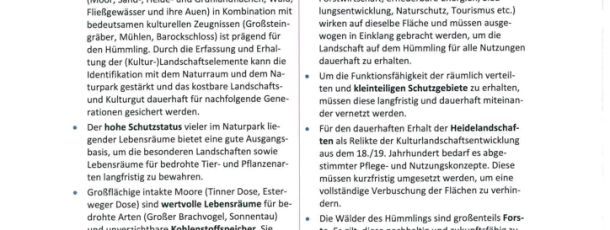 Schwerpunktmäßig sollten nach den Empfehlungen des Verbandes Deutscher Naturparke (VDN) in einem Naturparkplan die Bereiche Naturschutz/Landschaftspflege, Erholung/Tourismus sowie Landnutzung behandelt werden. Diese Bereiche finden sich im REK Hümmling wieder. Der Landkreis Emsland als Projektträger hat auf Basis des Regionalen Entwicklungskonzeptes (REK) der LEADER-Region Hümmling diese Handlungsfelder aufgefriffen und vertieft. Damit wurde sichergestellt, dass die im Rahmen des Erstellungsprozesses des Naturparkplanes zu definierenden konkreten Handlungsfelder und Ziele denen des REK Hümmling nicht zuwiderlaufen, sondern diese vielmehr stützen und ggfs. konkretisieren.