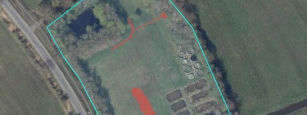 Die Fischteiche und Fischbecken, die auf dem Luftbild erkennbar sind, wurden bereits zurückgebaut. Der Teich im Norden des Grundstücks soll möglichst erhalten werden, wird zum Teil überplant, aber um den überplanten Teil in Richtung Süden verlängert.